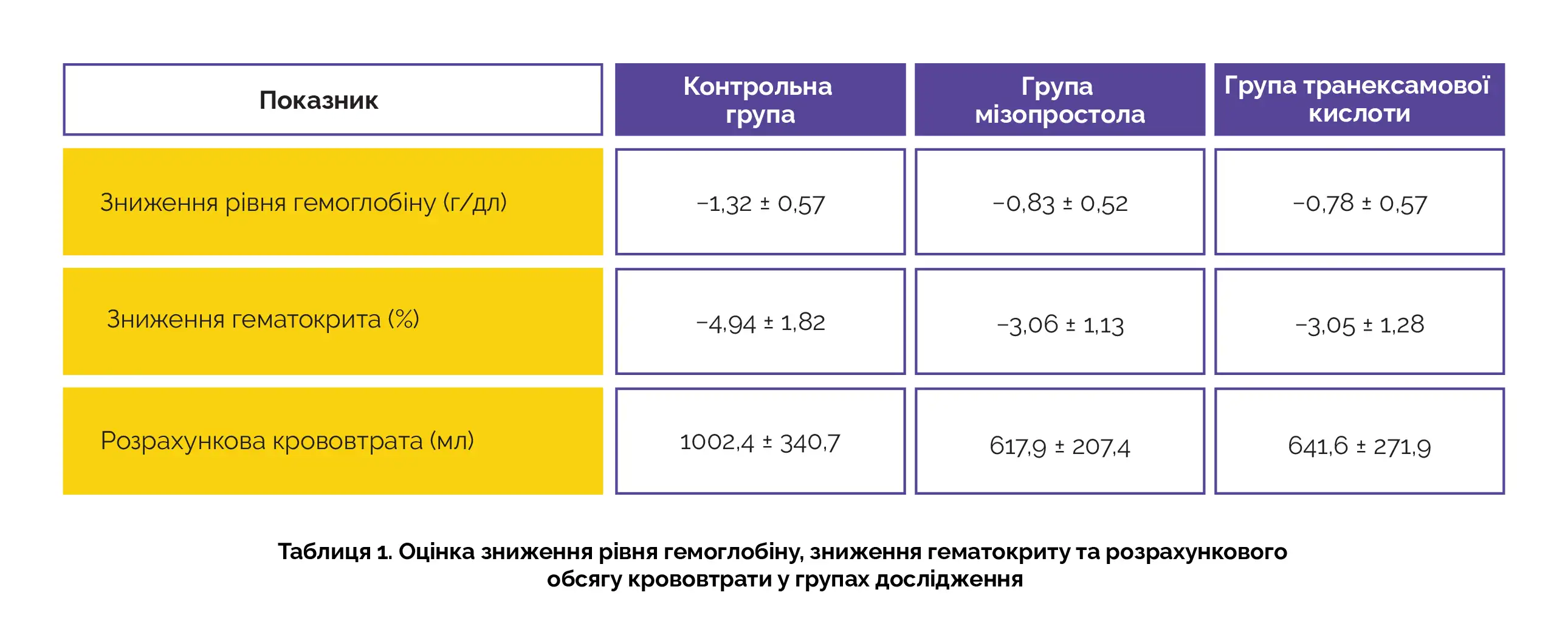У групах застосування мізопростолу та транексамової кислоти спостерігалися порівняні результати зниження як післяопераційної, так і інтраопераційної крововтрати. Однак порівняно з контрольною групою у групах транексамової кислоти та мізопростолу зниження рівнів гемоглобіну та гематокриту було статистично значуще нижче. Крім того, розрахунковий обсяг крововтрати був суттєво нижчий як у групі мізопростолу, так і у групі транексамової кислоти порівняно з контрольною групою (таблиця 1).