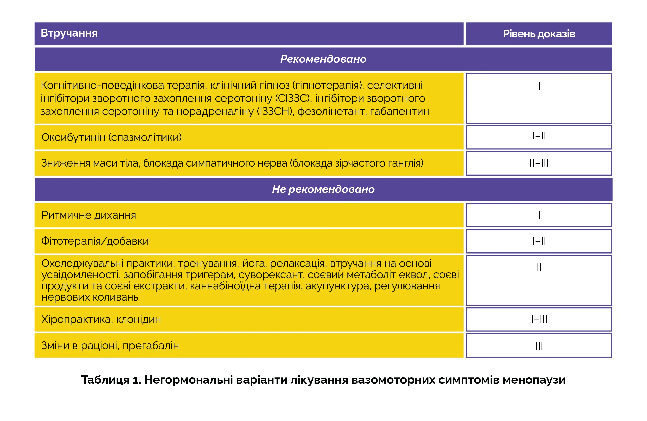 При ретельному вивченні наукової літератури, що ґрунтується на фактичних даних, було виявлено низку негормональних методів усунення вазомоторних симптомів (див. таблицю 1).