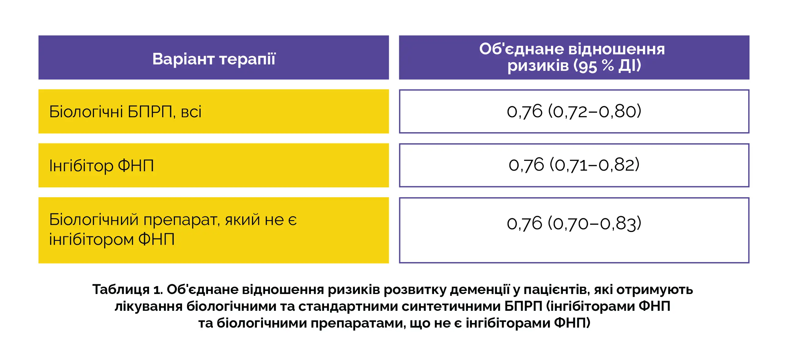 Встановлено, що таргетна терапія базисними протиревматичними препаратами (БПРП) на 30% знижувала ризик розвитку деменції та потенційно може розглядатися як спосіб профілактики деменції у пацієнтів із ревматоїдним артритом та високим відповідним ризиком.