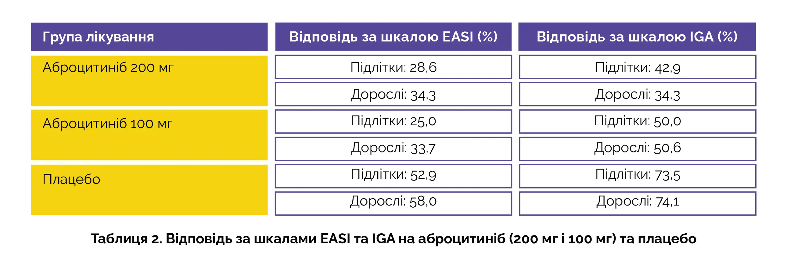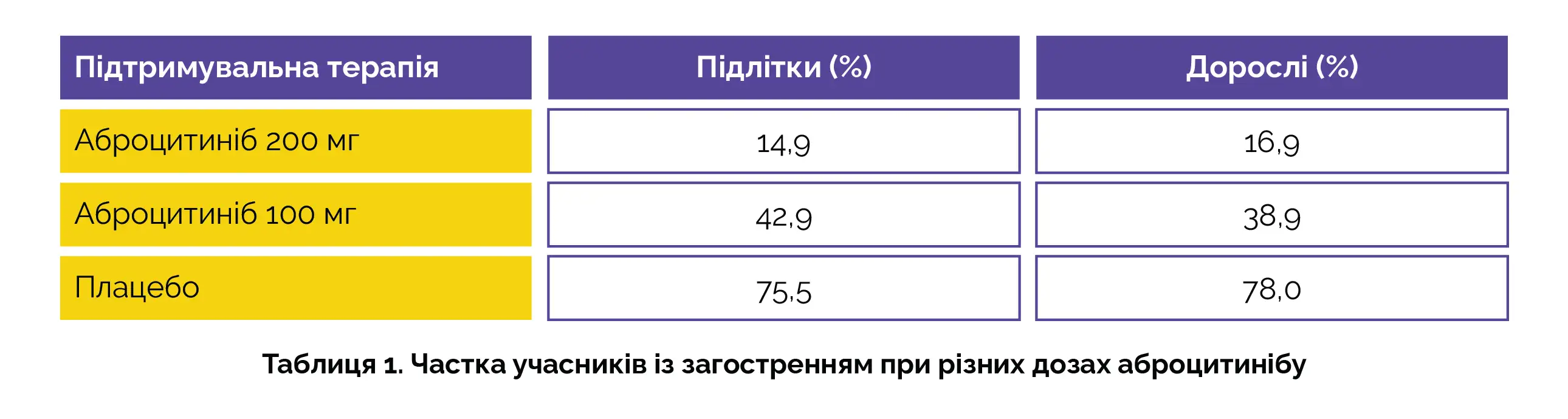 З 246 підлітків на індукційну терапію відповіли 145 (58,9%), серед 981 дорослого — 655 (66,8%). Частка загострень під час підтримуючої терапії аброцитинібом та плацебо була порівнянною (див. таблицю 1).