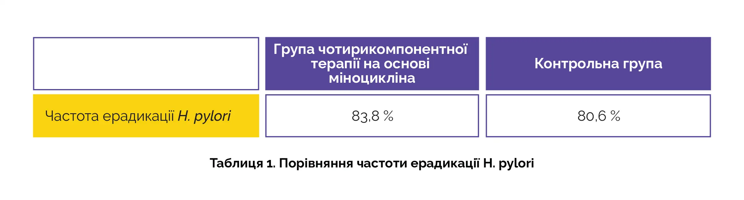 Чотирикомпонентна терапія на основі міноцикліну характеризувалася сприятливим профілем ефективності та безпеки щодо ерадикації H. pylori. Це дозволяє припустити, що її можна застосовувати як альтернативний варіант лікування.
