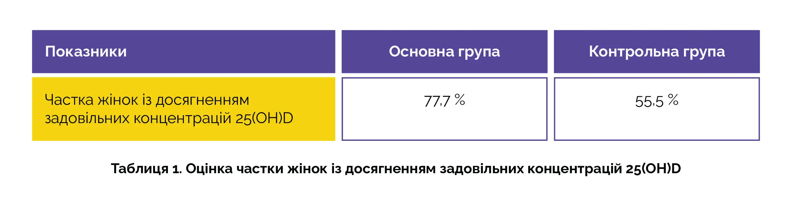 В основній групі (n = 112) було відзначено суттєве підвищення концентрації 25(OH)D на 24-28-му тижні вагітності порівняно з контрольною групою (n = 119) (скоригована різниця середніх: 6,52 нмоль/л; 95 % довірчий інтервал (ДІ): 2,74-10,31). Крім того, у більш високої частки жінок в основній групі було досягнуто задовільних концентрацій 25(OH)D порівняно з контрольною групою (p < 0,001) (див. таблицю 1).